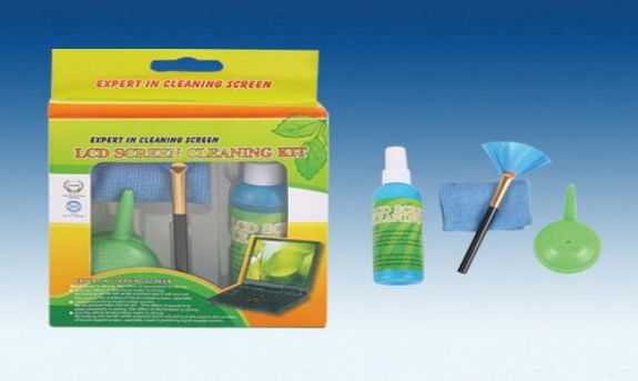 Bộ vệ sinh laptop bao gồm: Cọ, khăn lau chuyên dụng, dụng cụ thổi bụi, nước rửa màn hình.